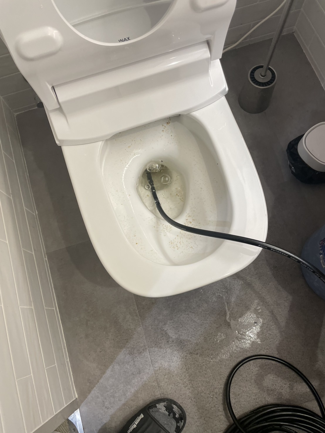 紹介する立場として今回の対応で評価できる点は、単に便器内のつまりを解消するだけでなく、排水管の奥までしっかりと洗浄している点です。ローポンプだけで一時的に流れを回復させる方法もありますが、原因が配管内部にある場合は再発の可能性が残ります。高圧洗浄機を併用することで堆積した汚れを除去し、排水の通りそのものを改善できるため、店舗のように使用頻度が高い環境では特に有効な作業といえるでしょう。