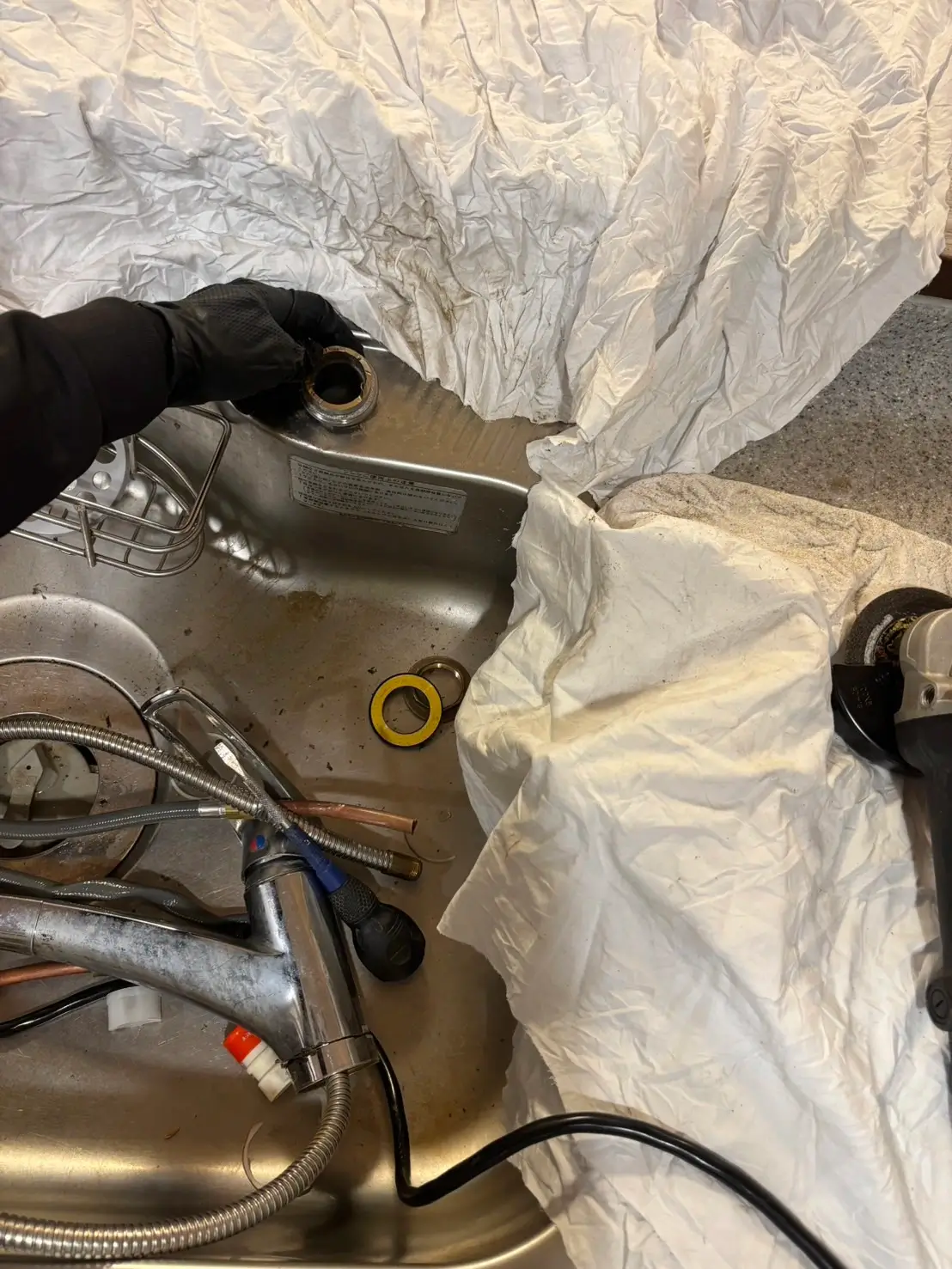 キッチン下からの水漏れということで現地確認を行ったところ、接続ホースの破損と蛇口本体の劣化が進行している状態でした。部分的な補修では再発の可能性が高いと判断し、今後の安全性を考慮して水栓本体とホースを含めた交換作業をご提案しました。施工時は周囲をしっかり養生し、水漏れによる二次被害が出ないよう配慮しながら作業を進めています。
