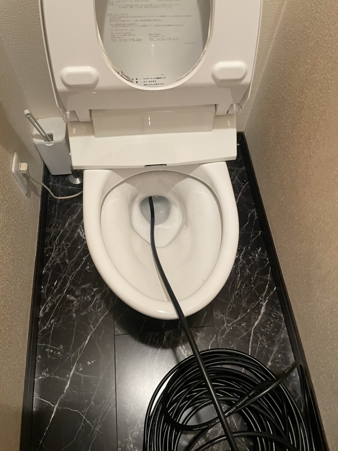 現地確認の結果、ローポンプのみでは解消が難しいと判断し、便器を一度取り外して内部の状態を確認したうえで、高圧洗浄機による配管内洗浄と枡洗浄、さらに汚水の汲み取り作業を実施いたしました。作業中は周囲をしっかり養生し、生活への影響を最小限に抑えるよう配慮しております。