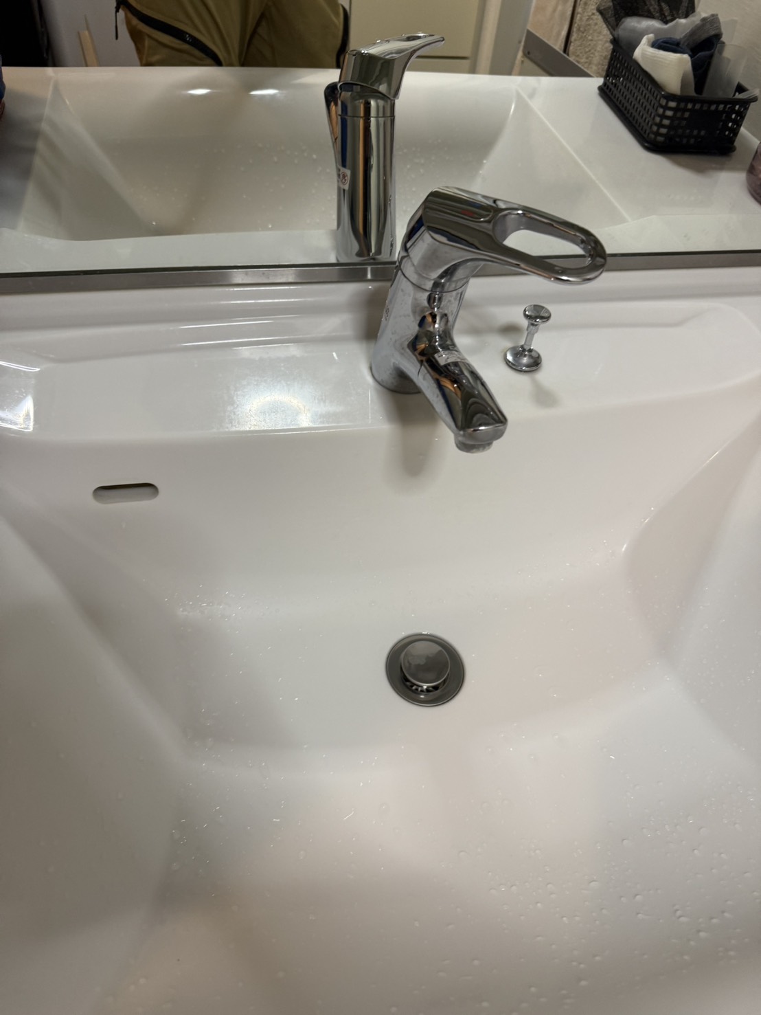 この度は洗面所専門チームへご相談いただき、誠にありがとうございました。洗面蛇口のレバー根元からの水漏れについて確認したところ、内部カートリッジの劣化により止水性能が低下している状態でした。